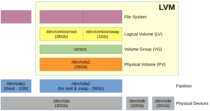- The /dev/sda2 (29Gb) partition is an extended LVM partition on which the /dev/sda2 physical volume is created.