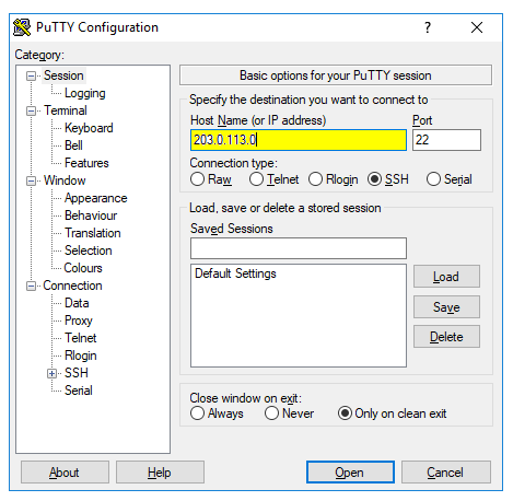 On the PuTTY Configuration screen, fill in the field labeled Host Name (or IP Address) with your VM's IP address, which you can find in the control panel. Confirm that the Port is set to 22 and that the Connection type SSH is selected.