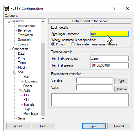 Next, in the Connection subheading in the Data configuration section, enter your server's username in the Auto-login username field.