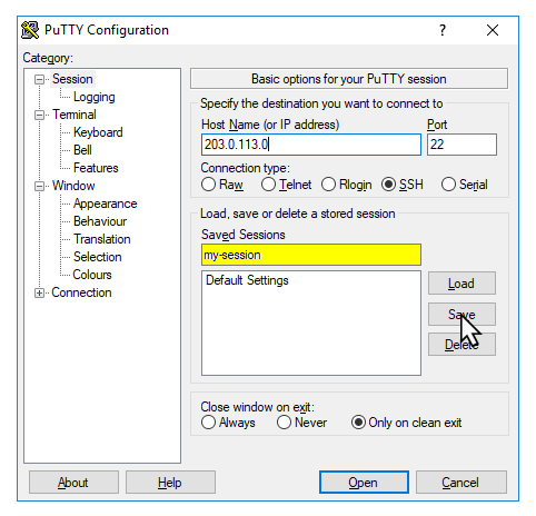 Finally, you can save these preferences to avoid typing them manually in the future. Click on Session in the left sidebar, then add a name in the text box under Saved Sessions and click Save on the right.