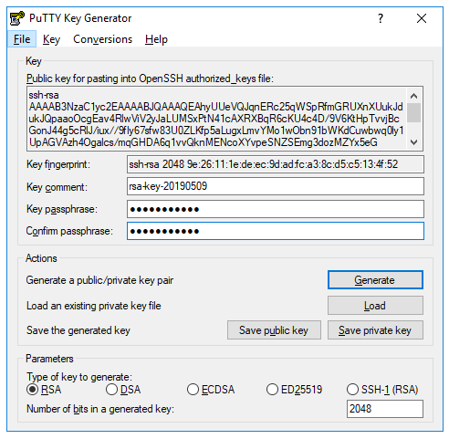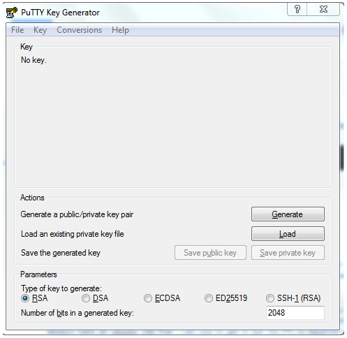 After the programs are installed, start the PuTTYgen program through your Start Menu or by tapping the Windows key and typing puttygen. The key generation program looks similar to this: