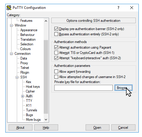 Search for the private key file, which ends in .ppk, and select Open in the file window.