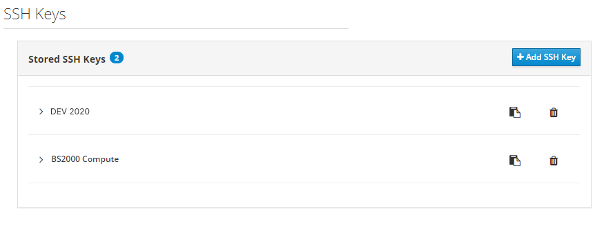 After saving, the key appears in the Stored SHH Keys window, where it can be copied for future usage or deleted.