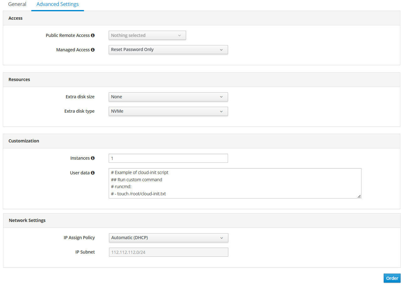 Public Remote Access– selecting public remote access (SSH/Cockpit). For each selected remote access protocol, a new port forwarding to a random port of the main public IP address will be created.Managed Access– managed access to the operating system environment (guest system), allowing additional actions such as password reset, installation of additional programs, OS updates, etc.Extra Disk Size– size of additional disk.Extra Disk Type– choosing storage class which is used for system disk (where operating system resides) of virtual machine.Instances- number of machines of the selected configuration in one service (in one Instance Group).User Data- configuration data for Cloud-Init or Sysprep, which help to configure the virtual machine after deployment and startup. This configuration can be used to install additional software packages, configure access by keys, execute other configuring commands. More details in the Cloud-Init Reference.-