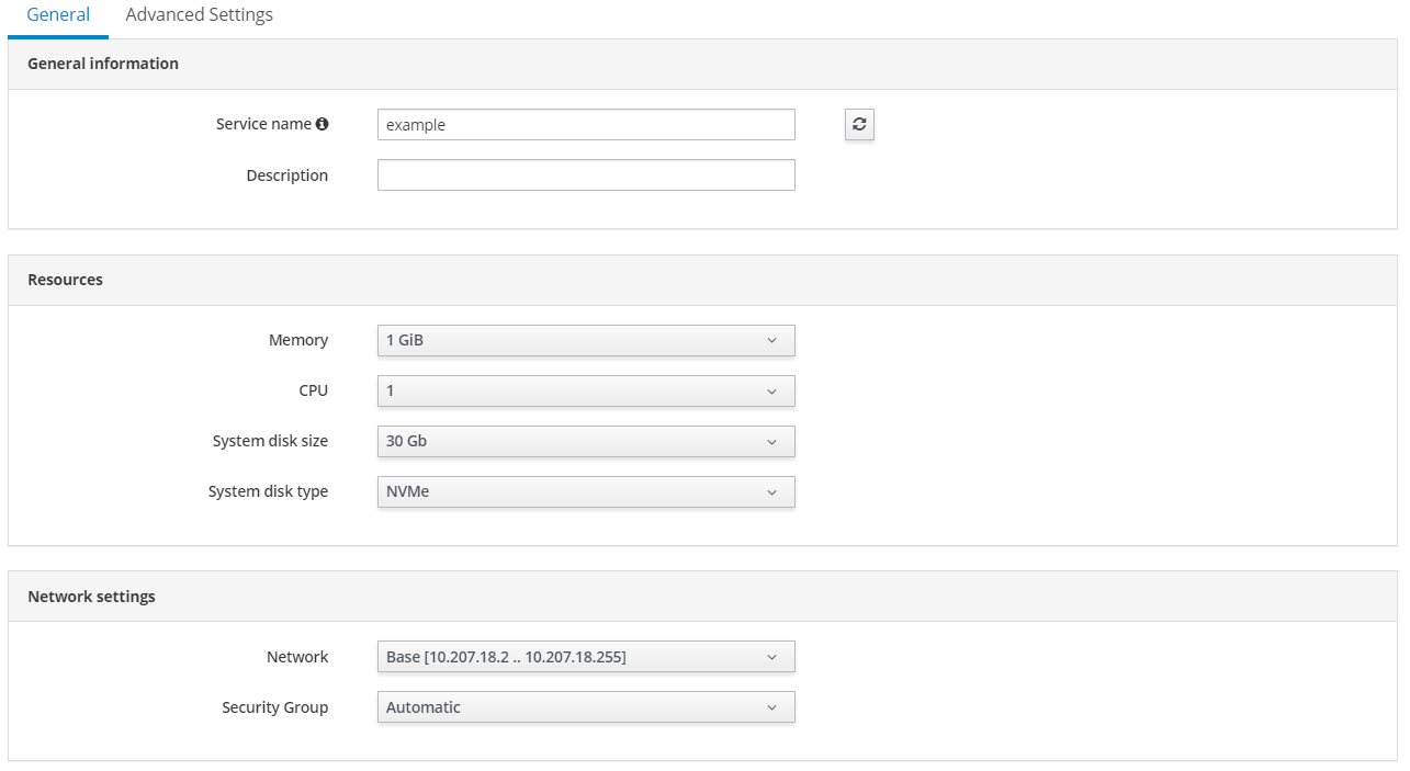 Service Name- a brief name for the service (only latin alphabet characters and the use of dash are allowed). By default, a simple, two-part service name is generated, which can be replaced with own name;Description- a more detailed description and purpose of the created service;Memory- the amount of RAM required for the virtual machine to operate;CPU- the number of CPUs required for the virtual machine to operate;System Disk Size- choosing the size of the system disk for the virtual machine;System Disk Type- choosing storage class which is used for system disk (where operating system resides) of virtual machine;Network- selecting the network type from the list of already available networks.