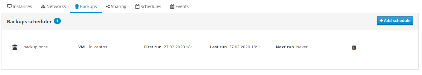 To schedule backup, you need to press the Add schedule button under the Backups tab.